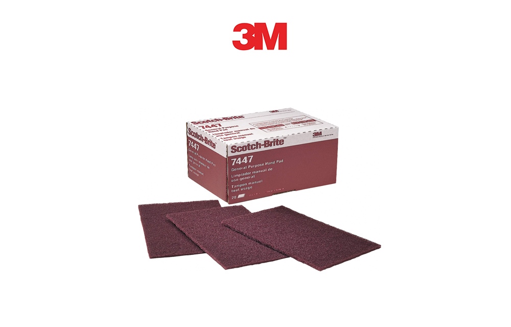 3M 7447 scotch brite rosso 158mmx224mm - Il tampone manuale Scotch-Brite? 7447 combina flessibilità, efficacia dell'azione di taglio e controllo preciso. Il nostro tampone manuale contiene ossido di alluminio abrasivo in grana molto fine che garantisce un taglio rapido ed efficace, lasciando la superficie levigata. Utilizza il tampone manuale Scotch-Brite? 7447 per una vasta gamma di materiali e attività. I nostri tamponi combinano flessibilità, efficacia dell'azione di taglio e controllo preciso, per risultati uniformi nelle applicazioni di finitura spinta. Sono particolarmente utili per le operazioni più difficili di pulitura. I tamponi Scotch-Brite? si usano come la lana d'acciaio di grado 1 ma, a differenza di quest'ultima non si frantumano durante l'uso, non creano ruggini né scheggedi metallo fini. Il materiale in tessuto-non-tessuto a trama aperta resiste all'intasamento e può essere usato a secco, con acqua e
