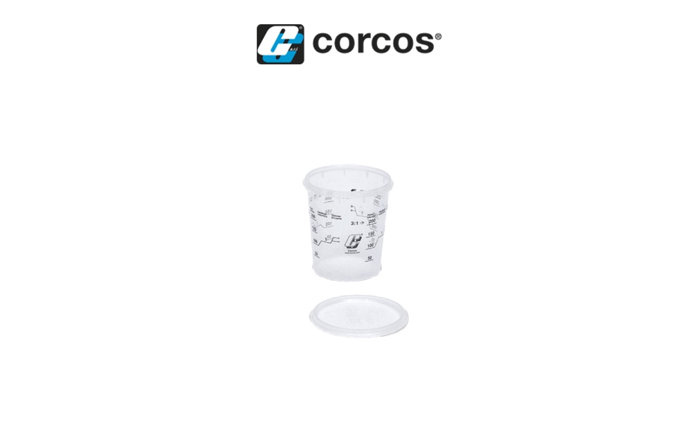 Corcos Contenitore in plastica serigrafato esternamente 200ml, 389A - Contenitore in plastica serigrafato esternamente in polipropilene (PP) con serigrafia esterna, monouso. Indicate per la miscelazione delle vernici sia a base acqua che solvente. Coperchi antigoccia disponibili per tutte le misure separatamente