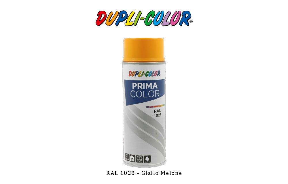 Dupli-Color Spray Prima Ral 1028 Giallo Melone 400ml - Asciuga velocemente, base acrilica qualità combinata al Nitro per svariati impieghi. Adatto per metalli, legno, carta, cartone, vetro, tessuti, pvc adatto alla verniciatura, ecc. Vantaggi del prodotto: ? vernice di alta qualità, con solventi ? asciugatura rapida ? ad alto rendimento ? alto grado di lucentezza ? resistente agli agenti atmosferici, alla luce e all'ingiallimento ? resistente ai graffi e agli urti