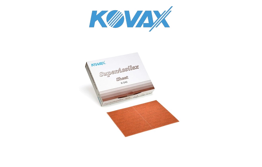 Kovax Superassilex K240 Sheet 130X170Mm 25pz - Il Kovax Super Assilex K240 Sheet è un abrasivo di alta qualità progettato per offrire una carteggiatura a secco estremamente uniforme e delicata. Questoprodotto è particolarmente indicato per la rimozione di difetti superficiali come polvere o piccole imperfezioni nel trasparente, prima della lucidatura finale. La grana K240 (equivalente a una P240manuale) consente di ottenere una finitura liscia e uniforme, riducendo al minimo il rischio di graffi visibili. Il supporto in lattice e la struttura del grano assicurano una lunga durata e una resistenza all'intasamento, permettendo di lavorare senza interruzioni e con un controllo ottimale. Ogni confezione contiene 25 fogli di dimensioni 170 × 130 mm, ideali per l'uso con blocchetti o levigatrici orbitale. La tecnologia di adesione "Super-Tack" facilita l'applicazione e la rimozione del foglio, garantendo una presa sicura