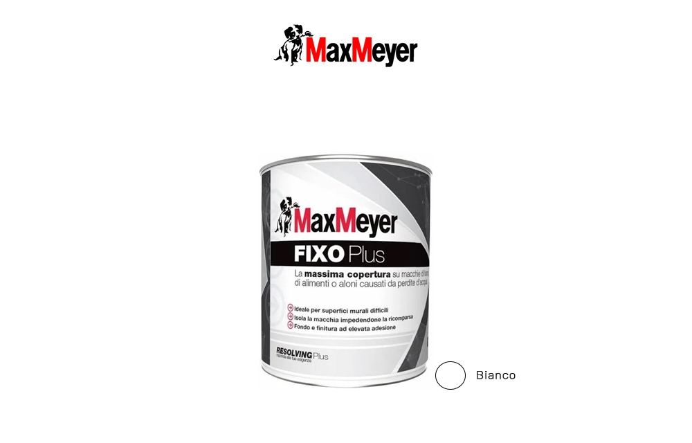 Max Meyer Fixo Plus, 2,5ml - Pittura antimacchia con massima copertura su macchie di fumo, alimenti o aloni causati da perdite d'acqua. Caratteristiche: -Isola la macchia impedendone la ricomparsa -Fondo e finitura ad elevata adesione -Ideale per superfici murali difficili. Resa 10/12 mq/l per mano.