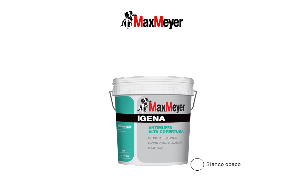 Max Meyer Igena Bianco Opaco, 750ml - Pittura lavabile antimuffa con elevato potere coprente adatta per superfici soggette all?azione di microrganismi infestanti. Caratteristiche: - Efficacia antimuffa testata UNI EN 15457 - Ottimo punto di bianco -Ottima diluizione -Buona resa. Resa 15/17 mq/l per mano.