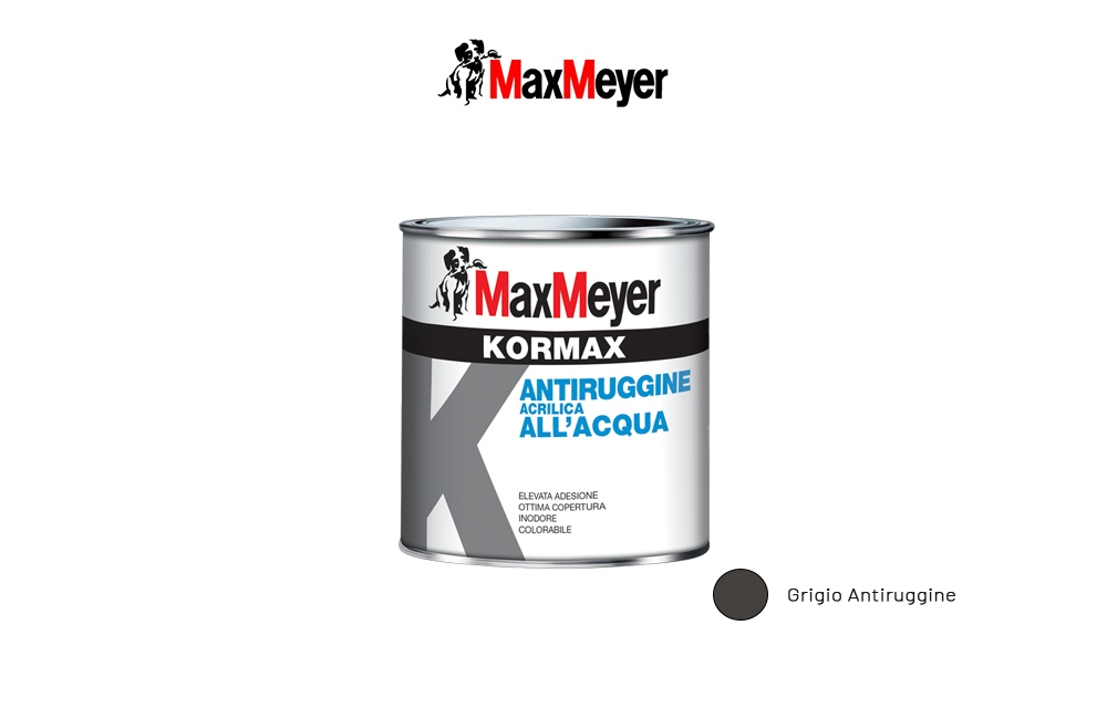Max Meyer Kormax Antiruggine Grigio Antiruggine, 750ml - Antiruggine acrilica all?acqua, formulata con speciali pigmenti anticorrosivi. Caratteristiche: -Interno/Esterno -Ferro, lamiera zincata, alluminio -Elevato potere anticorrosivo -Facile da applicare -Essicca rapidamente -Elevata adesione -Ottima copertura. Resa 12-13 mq/l per mano