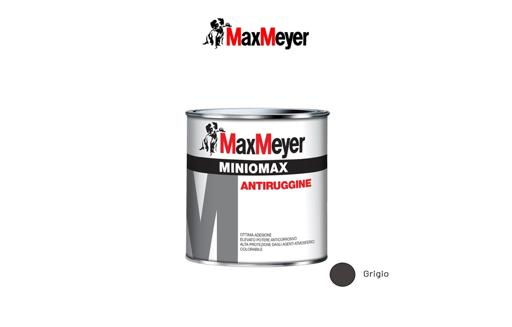 Max Meyer Miniomax Grigio, 2,5l - Antiruggine per ferro e acciaio. Caratteristiche: -Interno/Esterno -Per ferro e acciaio -Garantisce resistenza e protezione del supporto anche in presenza di elevataumidità -Buon potere anticorrosivo - Scudo antiruggine -Forte aderenza -Alta protezione -Facile da applicare. Resa 7/9 mq/l per mano.