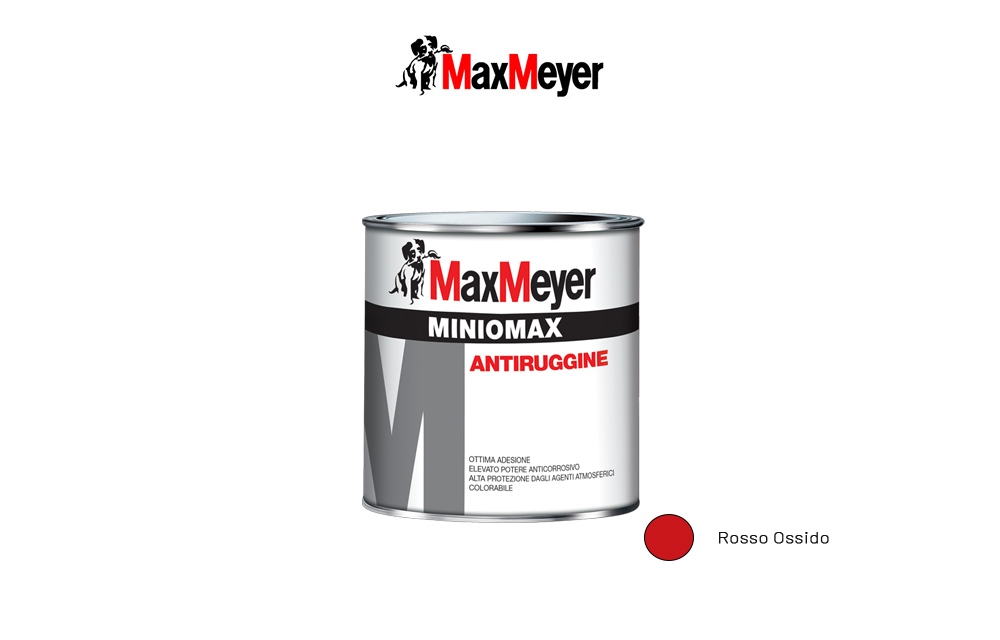 Max Meyer Miniomax Rosso Ossido, 2,5l - Antiruggine per ferro e acciaio. Caratteristiche: -Interno/Esterno -Per ferro e acciaio -Garantisce resistenza e protezione del supporto anche in presenza di elevata umidità -Buon potere anticorrosivo - Scudo antiruggine -Forte aderenza -Alta protezione -Facile da applicare. Resa 7/9 mq/l per mano.