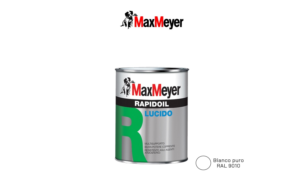 Max Meyer Rapidoil Bianco Puro RAL 9010, 375ml - Smalto lucido universale a solvente per superfici in ferro e in legno. Caratteristiche: -Resistente agli agenti atmosferici e alla luce -Buon potere coprente -Multisupporto -Pronto all'uso -Per interno ed esterno. Resa 13-16 m2/L per mano.