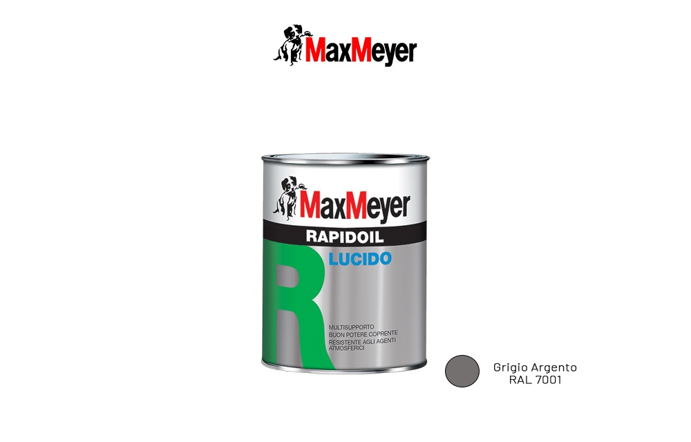 Max Meyer Rapidoil Grigio Argento RAL 7001, 2,5l - Smalto lucido universale a solvente per superfici in ferro e in legno. Caratteristiche: -Resistente agli agenti atmosferici e alla luce -Buon poterecoprente -Multisupporto -Pronto all'uso -Per interno ed esterno. Resa 13-16 m2/L per mano.