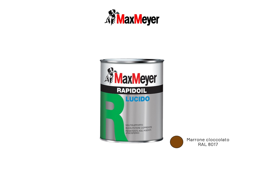 Max Meyer Rapidoil Marrone Cioccolato RAL 8017, 375ml - Smalto lucido universale a solvente per superfici in ferro e in legno. Caratteristiche: -Resistente agli agenti atmosferici e alla luce -Buon potere coprente -Multisupporto -Pronto all'uso -Per interno ed esterno. Resa 13-16 m2/L per mano.