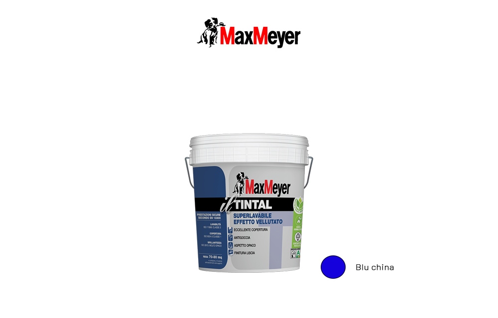 Max Meyer Tintal Blu China, 750ml - Pittura superlavabile antigoccia, ad elevata copertura, finitura opaca e vellutata, ideale per ambienti di pregio. Caratteristiche: -Alto potere coprente (Classe 1di copertura ? ISO6504-3 a 7 m²/L) -Antigoccia -Alto potere mascherante -Aspetto vellutato -Alta opacità. Resa 14/16 mq/l per mano.