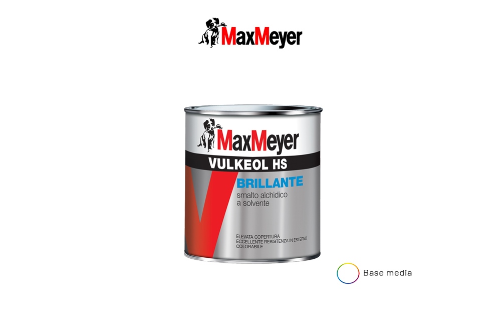 Max Meyer Vulkeol HS Base Media, 750ml - Smalto di finitura brillante di alta qualità per legno e ferro, a base di resine alchidiche, in fase solvente. Può essere utlizzato in interno e in esterno suqualsiasi supporto in legno, ferro e metalli opportunamente trattati. Caratteristiche: - Elevata copertura -Eccellente resistenza agli agenti atmosferici -Ottima elasticità e distensione del film -Ottima durezza del film -Basso ingiallimento. Resa: 14/18 mq/l per mano