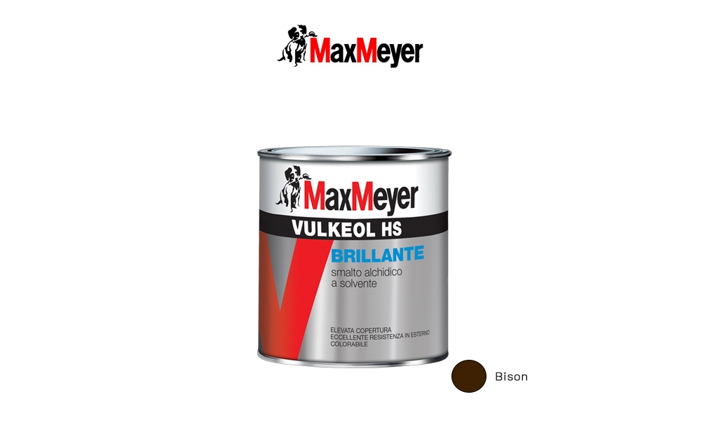 Max Meyer Vulkeol HS Bison, 750ml - Smalto di finitura brillante di alta qualità per legno e ferro, a base di resine alchidiche, in fase solvente. Può essere utlizzato in interno e in esterno su qualsiasi supporto in legno, ferro e metalli opportunamente trattati. Caratteristiche: - Elevata copertura -Eccellente resistenza agli agenti atmosferici -Ottima elasticità e distensione del film -Ottima durezza del film -Basso ingiallimento. Resa: 14/18 mq/l per mano